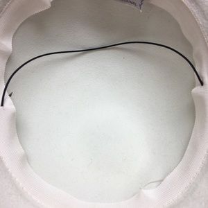 Felt hat labeled Gage Original, velour ribbon around, original on decorations, 20.5 inches around inside; there is rubber string inside to keep it secure on the head, in very good condition, no signs of wears. No fabric label inside but I think it’s felt.