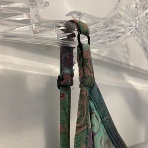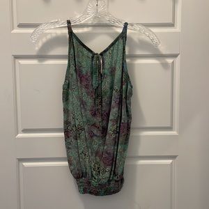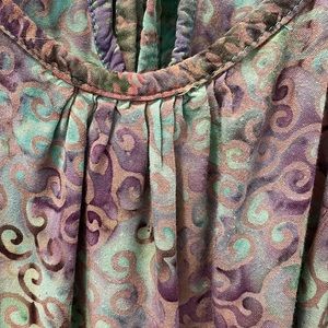 DRAGONFLY IMPORT small summer top. 100% rayon made in Indonesia, pretty green, purple and brown batik design. Elastic gathered at the waist. Pit to pit is 18 inches when stretched to bottom of elastic 14 inches.