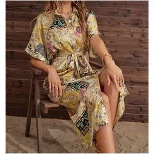 Boho Paisley Print Button up satin Dress