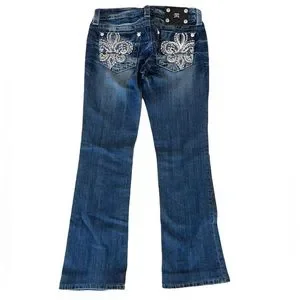 Miss Me Boot Jeans. Classic 5 pocket styling with single button and front zip closure. Fleur-De-Lis open pockets.