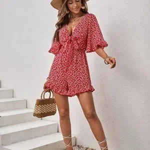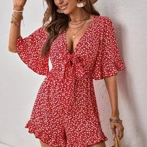 Red Boho Womens Ditsy Floral Tie Front Ruffle Hem Romper