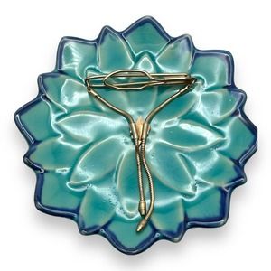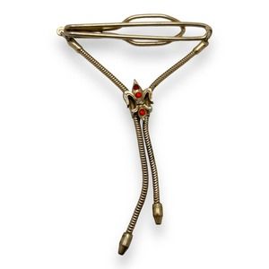 Beautiful vintage tie clip in gold-tone metal and snake chain tassels. This is in incredible condition and may be gold-plated, but there are no markings to confirm. The clip features a gorgeous fleur de lis design with red rhinestones and bolo-style snake chain tassels. Very unique and vintage!