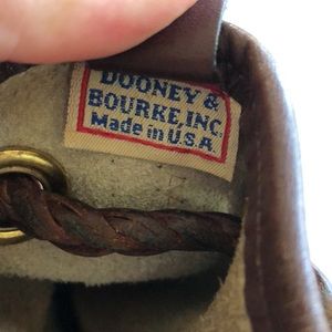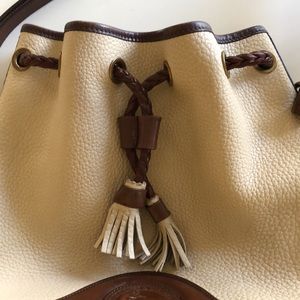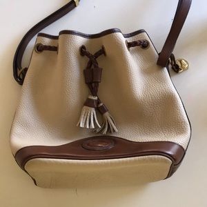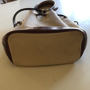 Dooney and Bourke tan and brown bag w pull string closure all weather leather w wear and tear please see photos small pen mark in bottom on interior clean non smoking home