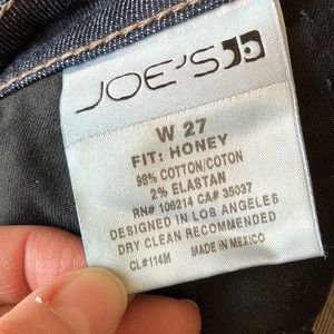 Joe's The Honey Booty Fit Jeans. Women's size 27 (equivalent to size small/4 according to website). "Marissa" wash/dark blue. Flared bottoms. Minimal wear. Approx measurements below: