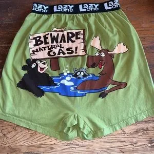 Lake Tahoe Boxers, size small, green, “beware natural gas”. Only worn a couple of times as women’s shorts, really good condition! Ready to be owned by you!