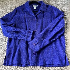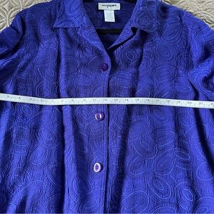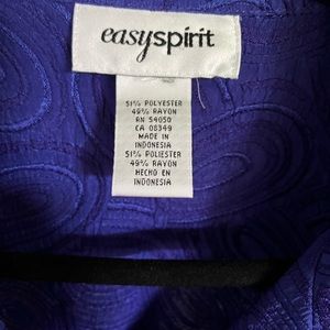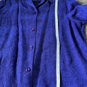 Easy Spirit brilliant purple heavy fabric poly/rayon blouse which could be worn as a jacket. Abstract stitched design. Long buttoned sleeves. Measures across armpits 23 1/2”, length 26” and sleeve length 24”. Absolutely gorgeous! Excellent condition. ❣️