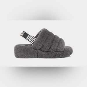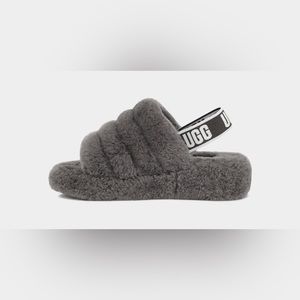 Details: Slipper + sandal, soft, plush sheepskin, lightweight platform, airy, elastic strap with Ugg graphic, woven label with Ugg logo on insole,