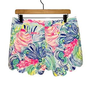Lilly Pulitzer Scallop Hem Buttercup Stretch Short 5" in Beach Please Multicolor Print. Cotton lycra blend. Pockets. Size Women's 4. Style 27896