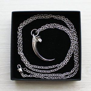 Brand-new in box Moon Raven eagle talon pendant on a 32" long necklace chain. The eagle talon pendant is a life size cast of a real American Bald Eagle claw. Both the pendant and chain are made of highly polished stainless steel, and will not rust or tarnish in the future. Stainless steel is extremely durable and is hypoallergenic, which makes it an excellent choice for individuals with metal allergies. The pendant measures approximately 1.5" length x 5/8" width x 5/16" depth. Made in the USA by an independent jewelry designer. Perfect for goth, indie, or minimalistic styles!