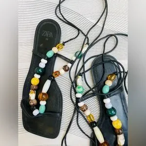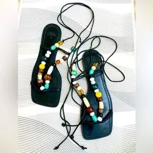 Brand new zara limited edition leather with beads summer lace up flat sandal