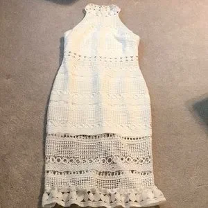 For the bride to be party. Gently worn. High neck with back zipper. Longer bottom overlay than mini length lined body. Darts at chest and middle band shows flesh through crochet design. Stunning with back walking slit