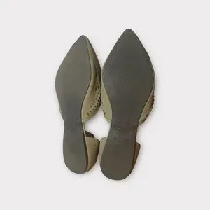 Olive green vegan suede flats with laser cut detail and pointed toe. Cute everyday shoe!