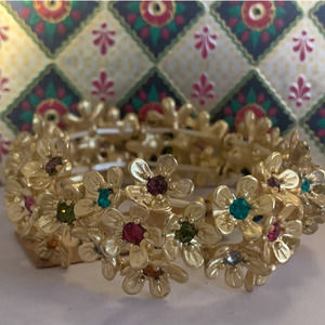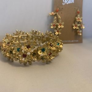 Rain brand-clustered matte gold toned flowers with multi-colored rhinestones set in the center-purple, teal, orange