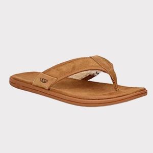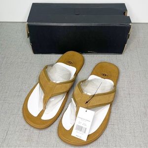 Ugg Mens Tan Seaside Tasmania Flip Flop Suede Leather Sandals. Suede leather upper. Plush sherpa lining under strap. Suede leather contoured EVA footbed. Molded rubber outsole. Heat embossed Ugg Logo. New in box, tag has been pulled off. Size 11.