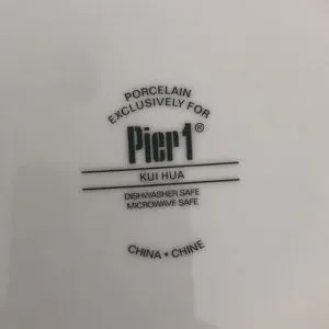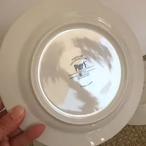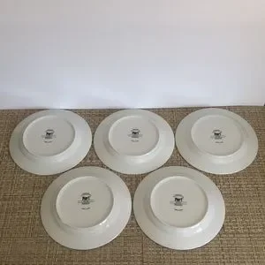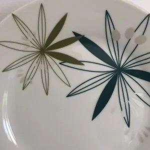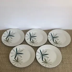 Gorgeous set of five Pier 1 KUI HUA salad luncheon plates. MCM starburst/atomic floral design. Pretty teal, olive green and a pearly silver/white. Excellent like new preowned condition. One plate has a manufacturer dot under the glaze. (Smooth to the touch-see last 2 photos) Another plate has a manufacturer defect where the pearly silver/white color dripped on the plate. (please see last 2 photos) The plates were made this way and are still stunning. Add to your collection or start one today! If you have any further questions I would love to help. Unable to bundle due to weight.