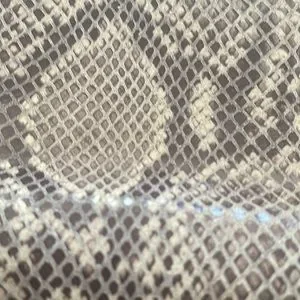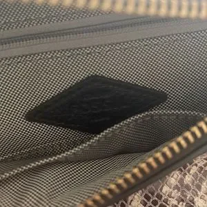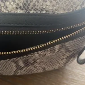 Snake skin Fossil Fanny pack with gold zipper and grey plaid interior black leather adjustable strap