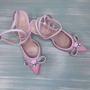 Women's High Heeled Sandals Pointed Toe Double Crystal Bows Glitter Satin Backless Ankle Straps Buckle Stiletto Slip on Pumps. EU 41. Heel height 3.5”. Never worn.