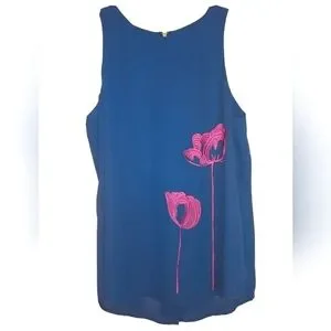 This 41 Hawthorn has so many little details that make it unique. gold tone zipper back of neck, lined, yet unlined on bottom half of back only paired with slightly sheer slit in back for loose flowing look! the bright pink embroidered oversized flowers contrast greatly against the navy backdrop. measurements and tags in pics. lighting is bright so navy may look darker in everyday lighting.
