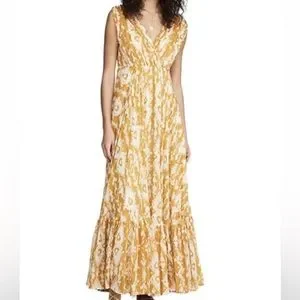 Mes Demoiselles Samarcande Cotton Tribal Pleated Sleeveless V-Neck Maxi Dress