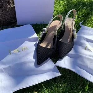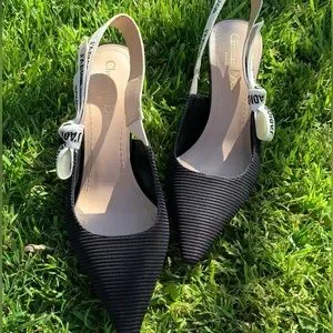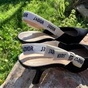 Crafted in the Christian Dior Italian ateliers, the silhouette is distinguished by black technical fabric. The two tone embroidered ribbon is embellished with a flat bow and 6.5 cm comma heel offers the final elegant touch