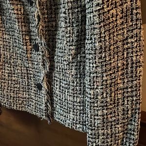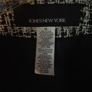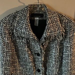 Black and white fully lined boucle knit Jones, New York blazer with fringe trim. Absolutely gorgeous. Perfect condition. Size 10.