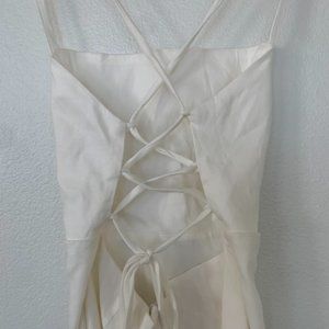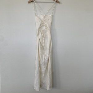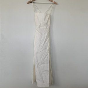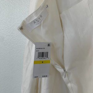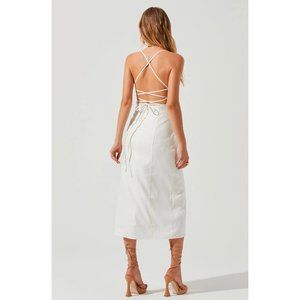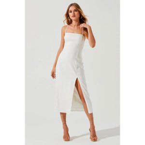 NWT White ASTR Women's Brayden Strappy Back Midi Dress in size medium! The Brayden Dress features an elevated linen-blend construction. Square neckline that leads to a darted bodice and column silhouette. Side slit accent. Adjustable strappy back. Concealed back zip closure. Fully lined.