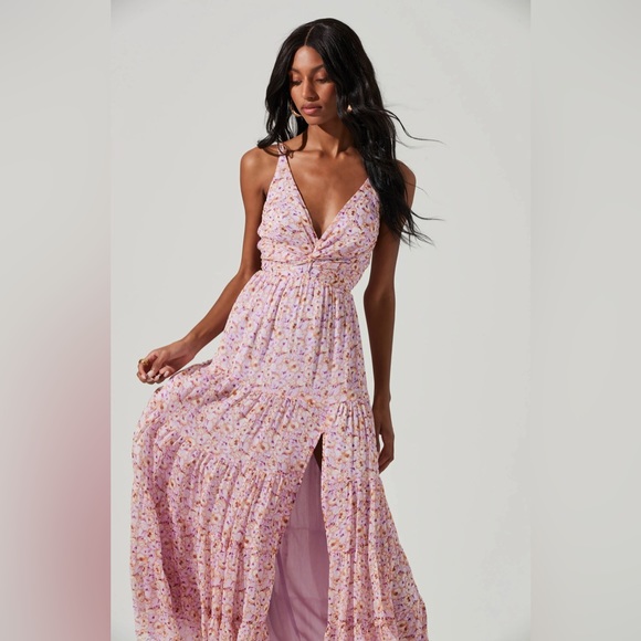 The Elsa Dress features a sweet floral print that instantly elevates your occasion look. Plunge neckline leads to a gathered bust. Tiered maxi skirt features a front slit accent. Tie back. Adjustable straps. Concealed back zip closure. Fully lined.