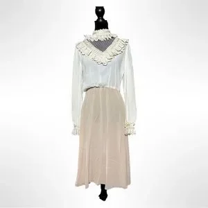 Amazing Vintage 70s Sheer Lace Collar Cuff Midi Dress Ruffle Lot 9/10