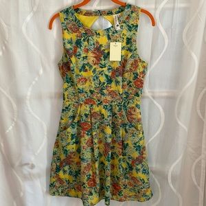 NWT, Pink Owl Yellow Floral Print Dress, Small. Adorable yellow with green & orange floral print. Dress is fully lined, has 2 front pockets, back zipper, closes behind neck with 2 buttons and has a cute cutout in upper back. Measures 16” from armpit to armpit, 13” across waist, 33” from shoulder to hem.
