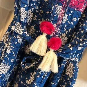 A long belted tunic, aka the most relaxed silhouette we can think of, is what we plan on wearing all summer long. This one has special-extras like a pom pom trim and a fun block print. This dress is made with organic cotton that is grown without chemical fertilizers and pesticides from non genetically modified seeds.