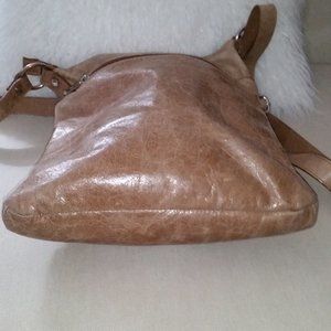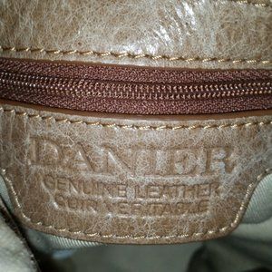 Danier leather natural colour messenger bag Three outside zippered pockets. One zippered interior pocket with two open, and key fob.