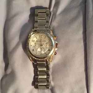 Beautiful Michael Kors watch. Silver and rose gold. Small crystal stones around face of watch. Come with original box and extra link to make watch bigger around wrist. Needs battery. Some light scuff marks around band of watch.