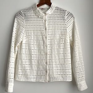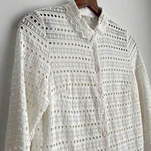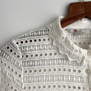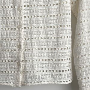 This Boden White Macie Lace Eyelet Button Down Top is simply adorable! Features include long sleeves, front button closure, scalloped edged collar and an eyelet cutout design. Light and breathable! A vintage inspired design. This top has a relaxed fit yet it gives a flowy feminine shape. Pair with a white or nude colored cami. Made of 100% cotton. Lining: 100% polyester.