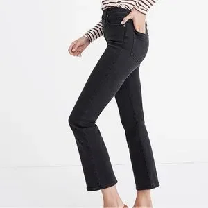 High rise, fitted through hip and thigh, cropped kick out leg.