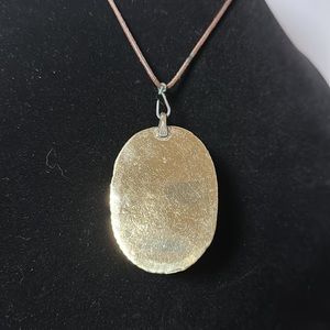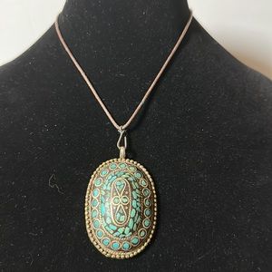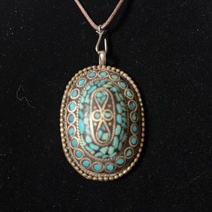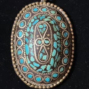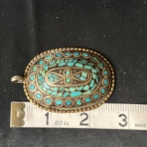 This is a very pretty and unique piece. After some research I found that it is from Persia and they design is turquoise chips inlaid into brass and copper. The leather necklace is not included. This piece measures 2.75” x 1.75”, and weighs 1.2 oz. The condition is very good previously owned.