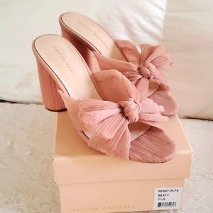 These gorgeous mules were worn once to my son's Bar Mitzvah. Super comfortable and light. Heel height 4 inches, width Medium. Original box included .