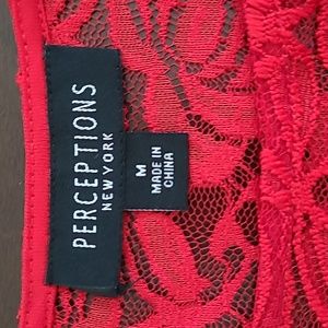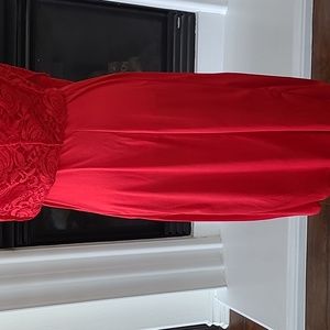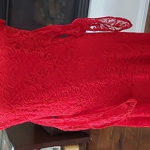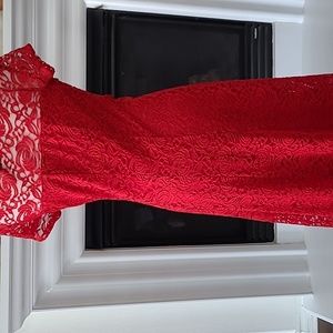 Beautiful red lace dress, used only 2 times. In Great almost new condition. Bust 18" flat, waist area un stretch is 15" length is 44". Belt is adjustable to your waist, which is attached. Dress has some stretch, see photo for material contents. It is a true red ( not orange). You will receive many compliments.