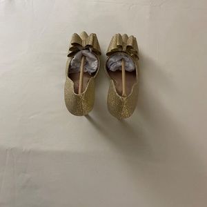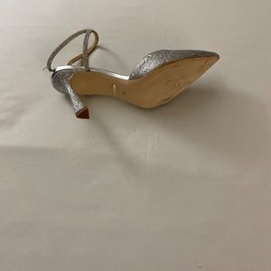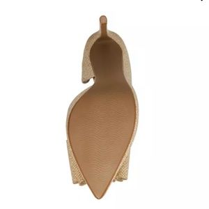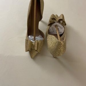 A gorgeously classic silhouette gets an interesting twist with a d'Orsay cut and a layered bow over the toe. Sparkling metallic fabric covers the Prince pumps from Betsey Johnson.