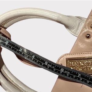 GUC two-toned handbag in soft pink and cream. Measurements in the pics. very large Badgley Mischka handbag. There is room for an iPad and so much more. The inside of the bag is clean. Minor scuffing and bottom shows a mark. Faux leather.
