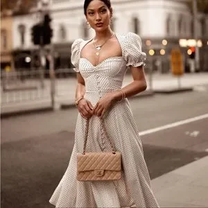 Feminine and floaty and perfect for Vacays. 'Ellery' is constructed from a lightweight crepe in a pretty polka dot print. The Neckline is a very flattering sweetheart shape that is good for all bust sizes as it's so wearable. It's gathered prettily with buttons to the front. The pretty puff sleeves have a special internal construction to ensure they stay upright and full and the bodice has lightly lined cups and cinches in at the waist for the prettiest silhouette. The skirt flares out and it has self covered buttons to the front that you can undo as high as you dare. It's fully lined.
