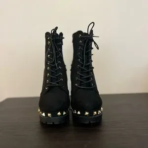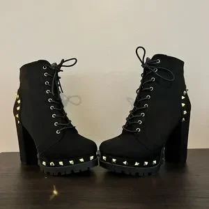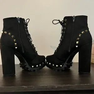 Fashion Nova brand black suede ankle boots with gold stud accents. Only worn in the house! They are basically brand new, they’ve been sitting on my shoe rack since I bought them!! 5-6 inch heel