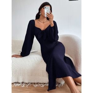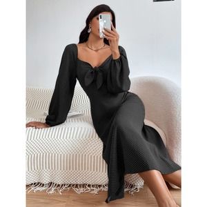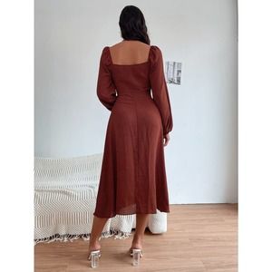 Polka Dot Print Knot Front Lantern long sleeve midi Dress rust brown