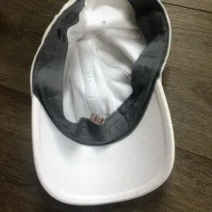 Worn a few times, washed, adjustable strap, in good shape. White with metallic pink logo