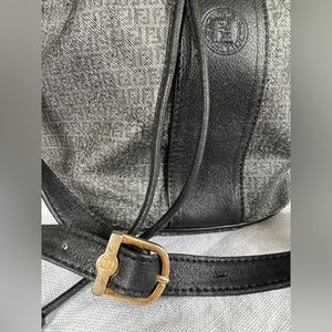 Vintage Fendi Bucket Bag. Authentic with serial number. Medium size. Gray Fendi FF logo with black leather accents. Embossed Fendi logo on front. Adjustable crossbody strap with gold Fendi buckle. Signs of wear on leather where logo is faded. Crossbody strap has some wear and damage, see photos. Could be repaired. Fair, vintage condition, reduced price reflects condition.