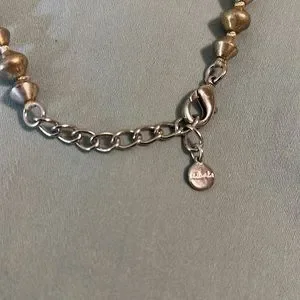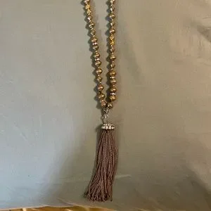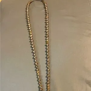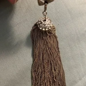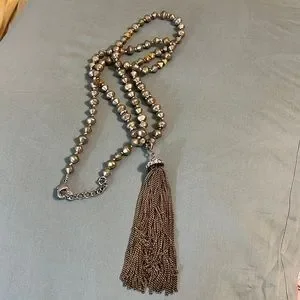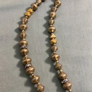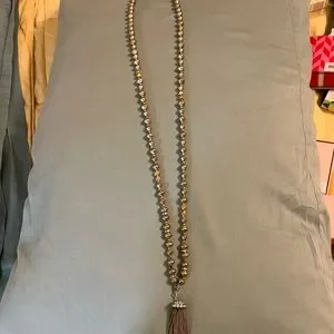 32” long mixed metal beads with rhinestones and detachable chain tassel. Looks FAB with everything! EUC. (Original box is a bit squished)