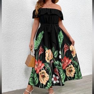 Plus size floral print off shoulder belted ruffle trim maxi dress