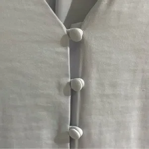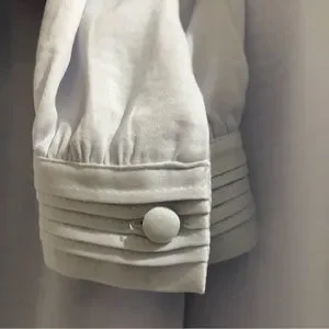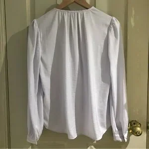 Very subtle periwinkle blue shirt that’s perfect for dressy casual or business settings. The blouse is silky and can appear off white under a bright light. The fabric buttons all function perfectly. See close-up photos for buttons and trim details on the sleeves. I find myself reaching for darker colored shirts more and never had the chance to wear this shirt as much as I hoped to. 100% polyester, machine washable in cold water. No flaws, rips, or stains.