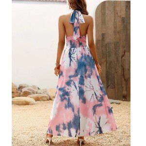 Multicolor Boho Womens Tie Dye Backless Shirred Halter Dress
