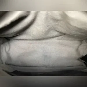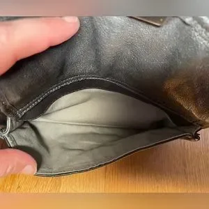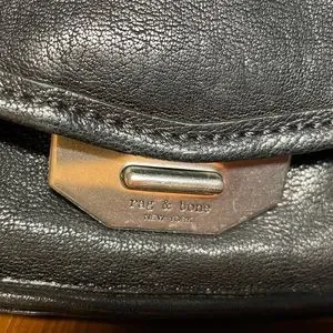 Materials: soft, supple black leather exterior, black leather interior patch pocket, gray cotton lining, silver hardware