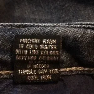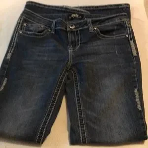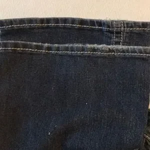 EUC denim jeans. Stretch. Small flare. Some wear at hemlines as shown in photo. Silver decorative topstitching. Distressed color. Approximate measurements are waist 34” and inseam is approximately 32”